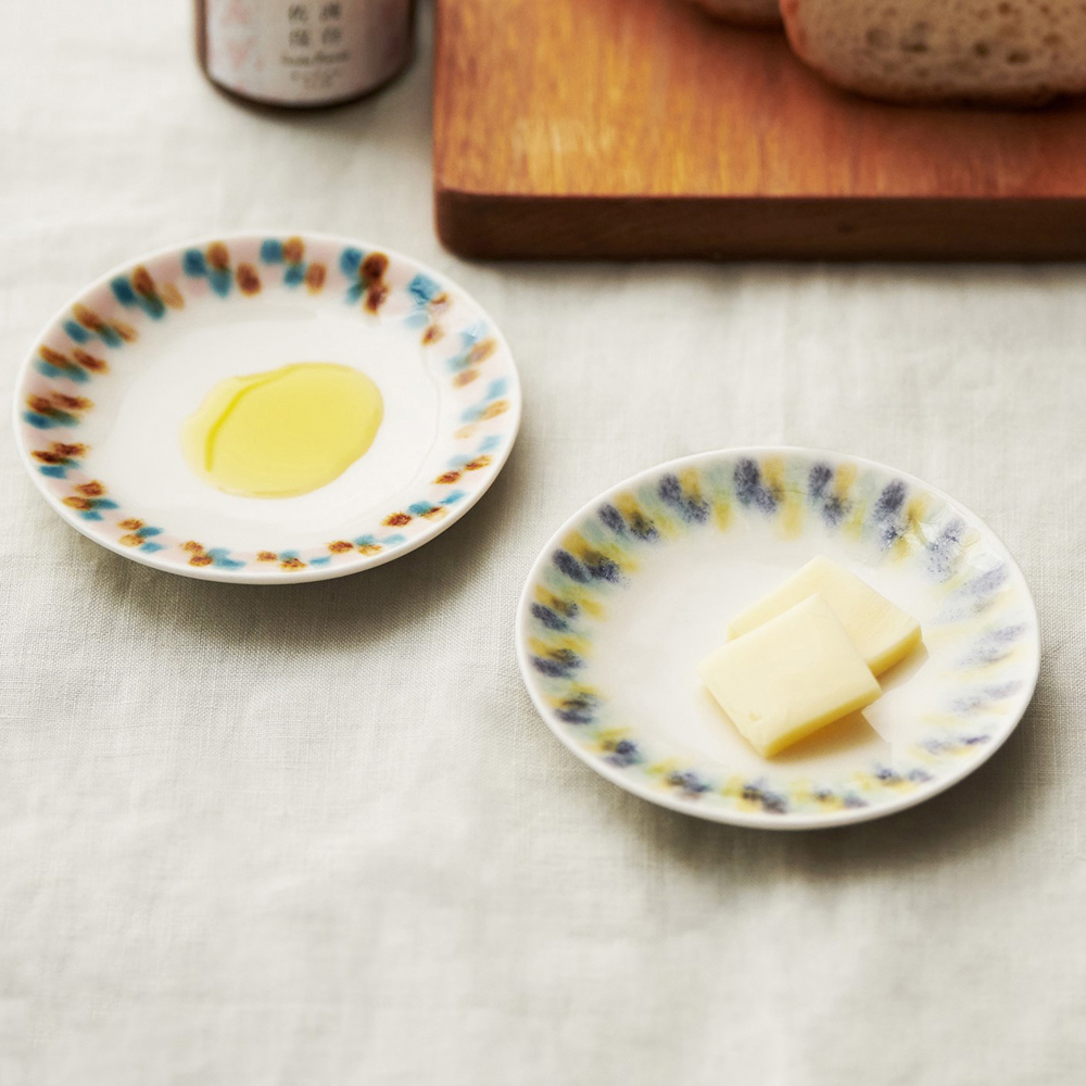 彩り豊かな霞シリーズの豆皿ペアセット。オリジナルの箱に入った贈り物におすすめのアイテムです。