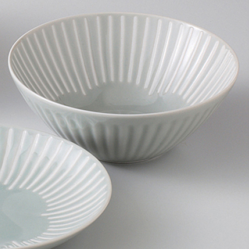 撥水の技法でシンプルにストライプと花をデザインしたボウルとプレートの4ピースセットです。